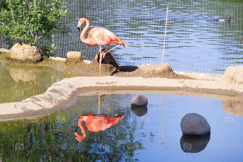 Розовый фламинго у воды в зоопарке