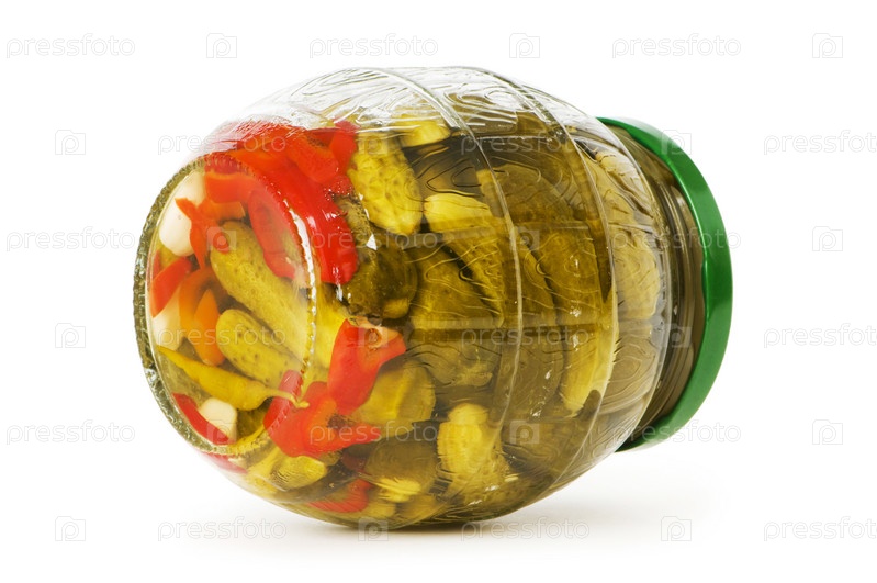 Банка маринованных огурцов на белом фоне