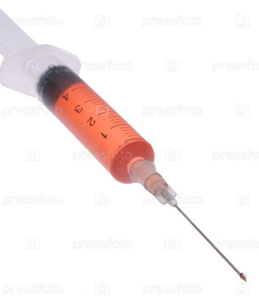 Медицинский шприц, заполненный красным лекарством на белом фоне