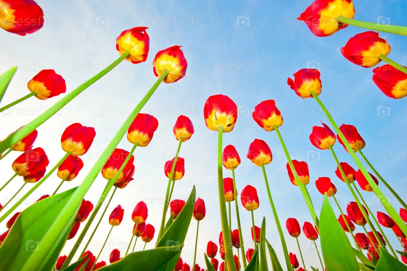 Красные тюльпаны на фоне голубого неба