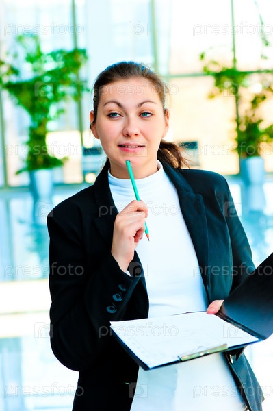 Молодая брюнетка в деловом костюме, задумавшаяся над предложением