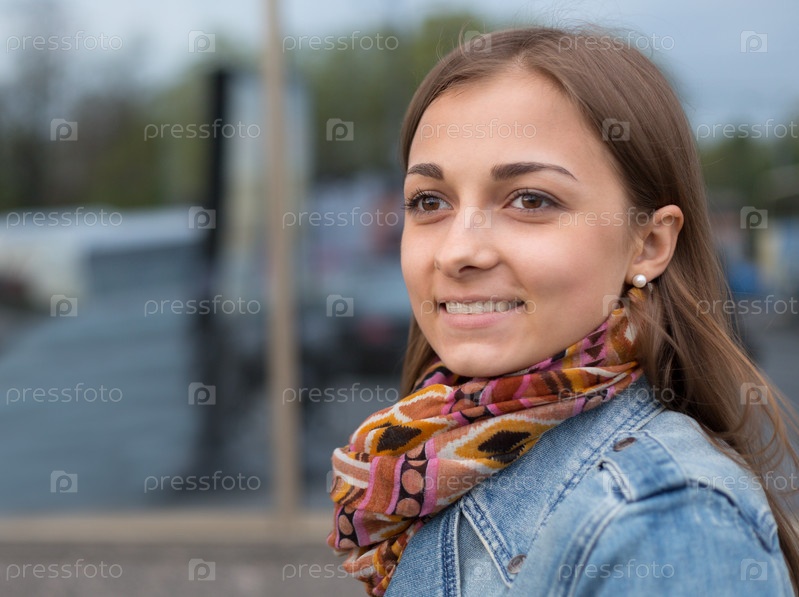 Красивая девушка в джинсовой куртке с шарфом