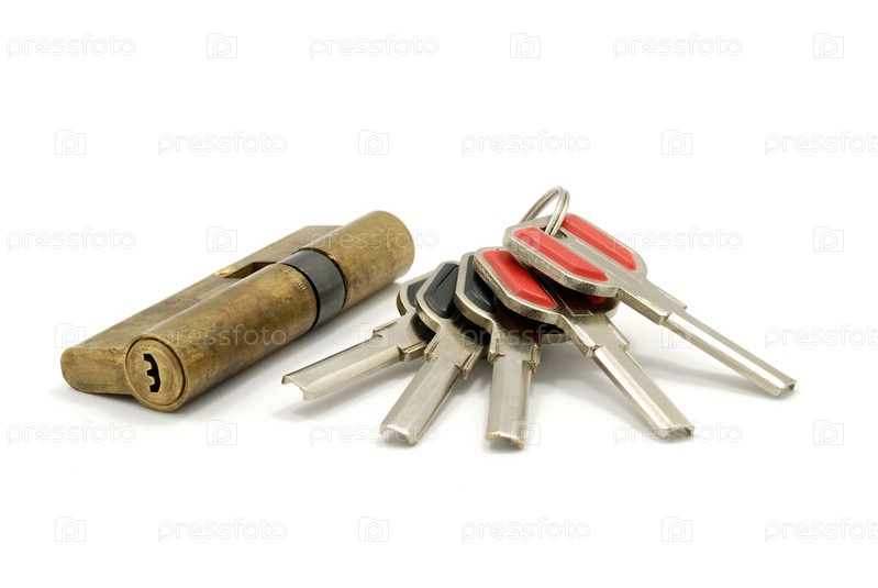 Связка ключей и замочная скважина на белом фоне