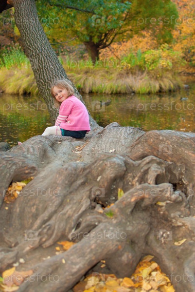Девочка сидит на дереве у пруда