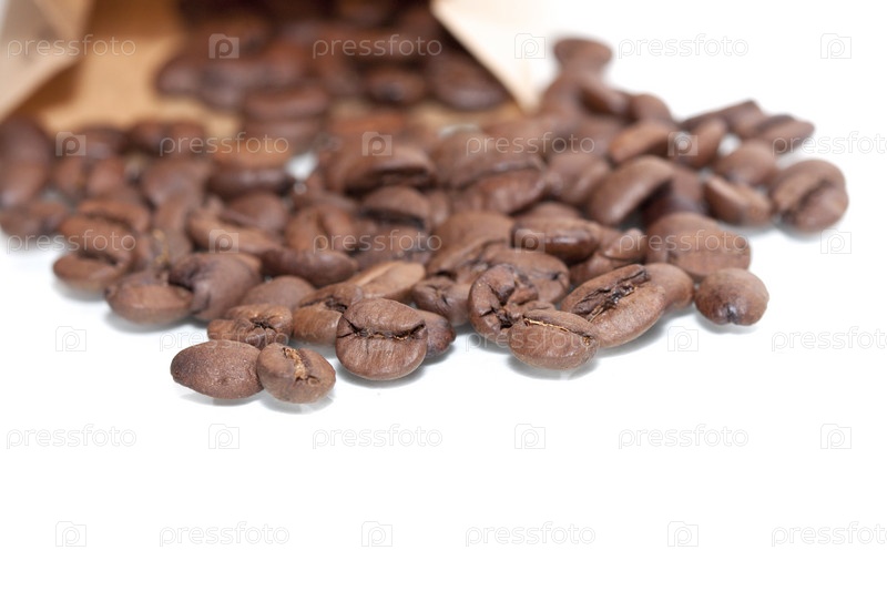 Кофе в зернах просыпано из бумажного мешка