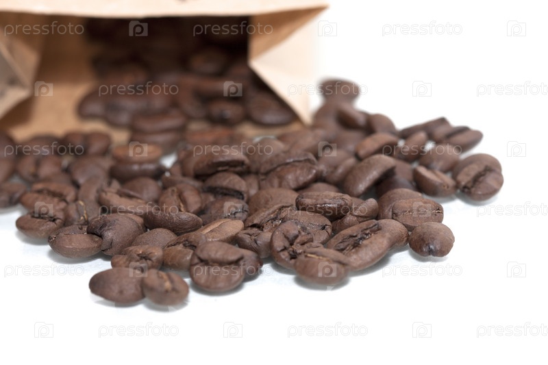 Кофе в зернах просыпано из бумажного мешка