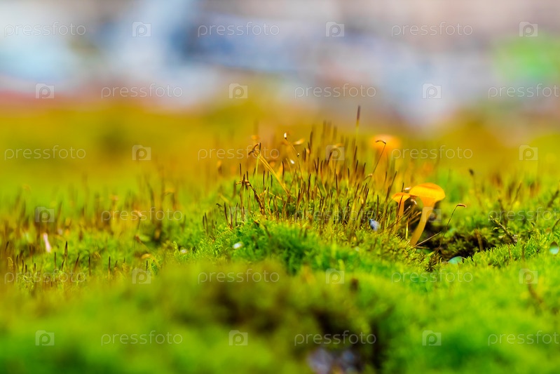 Макросъемка, оранжевые грибы, растущие на мхе