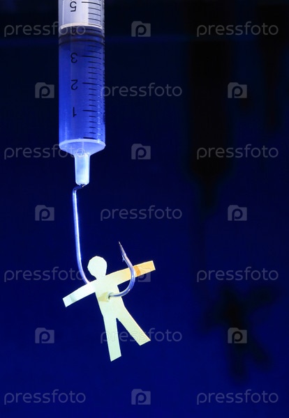 Желтый бумажный человечек на рыболовном крючке, торчащем из шприца