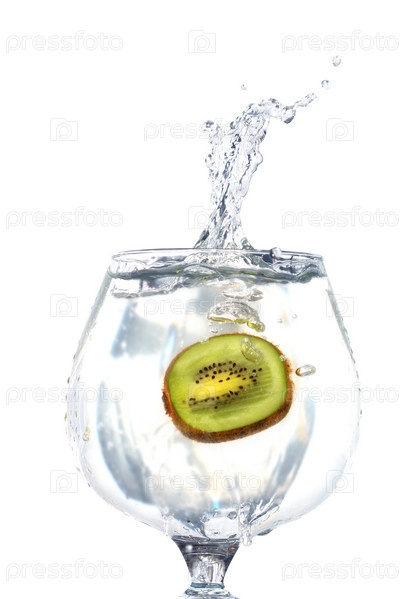 Всплеск воды от киви в бокале на белом фоне