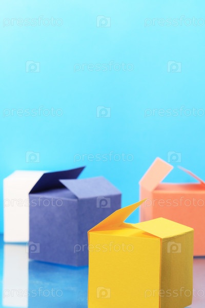Четыре цветные бумажные коробки на синем фоне