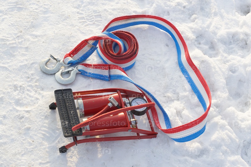 Буксировочный трос и насос на снегу