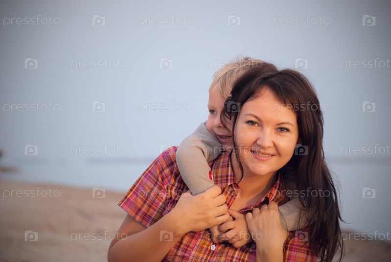 Мама и сын играют на берегу моря