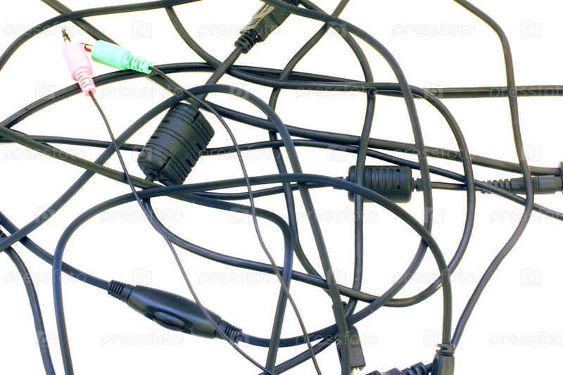 Провода от различных устройств на белом фоне