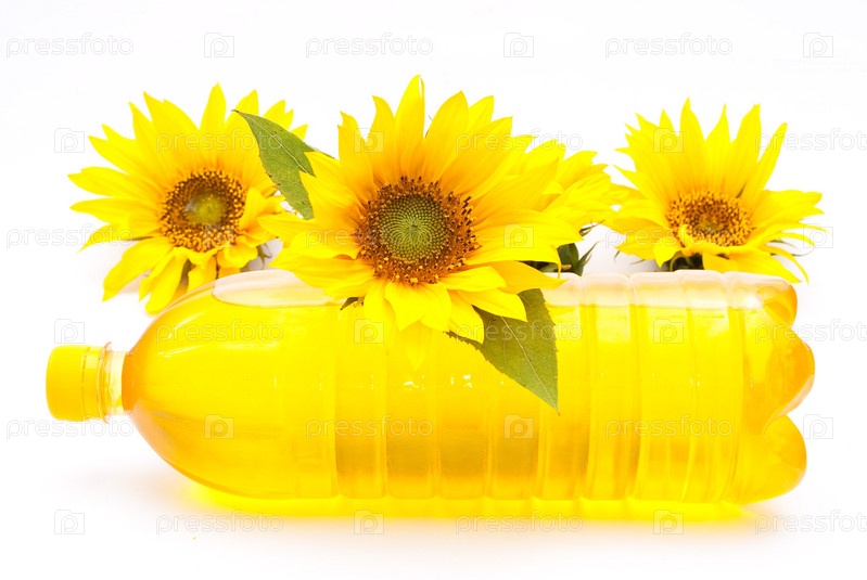 Подсолнухи и бутылка подсолнечного масла