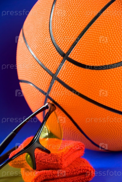 Баскетбольный мяч, спортивные очки и напульсники на синем фоне