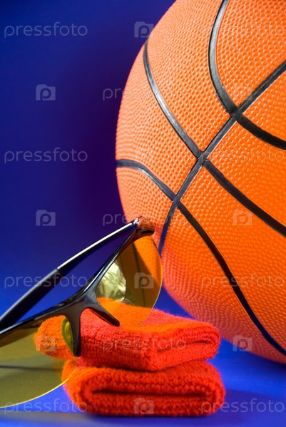 Баскетбольный мяч, напульсники и спортивные очки на синем фоне