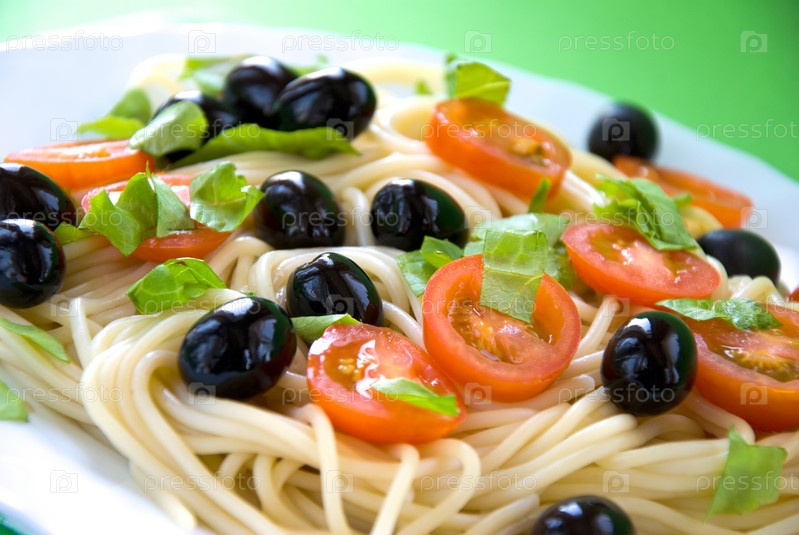 Спагетти с помидорами черри, маслинами и салатом