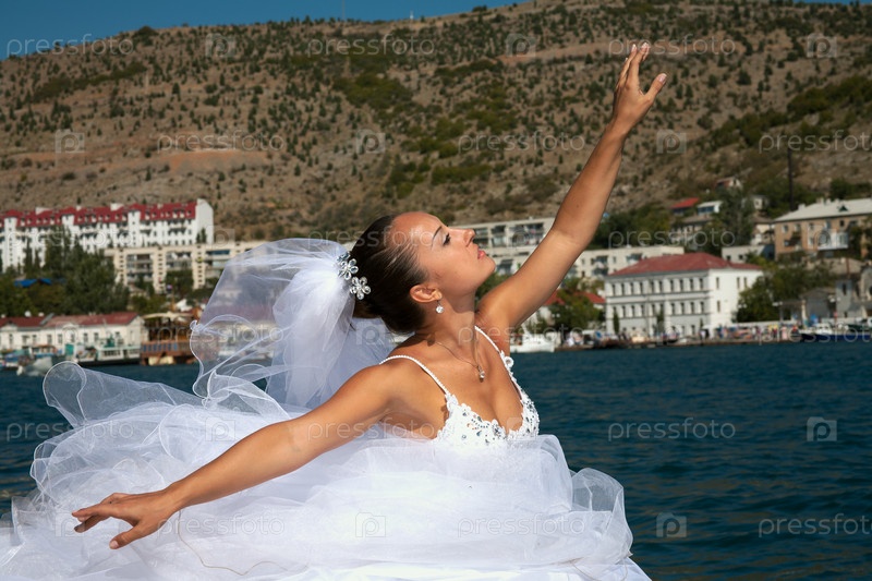 Невеста в свадебном платье на фоне моря