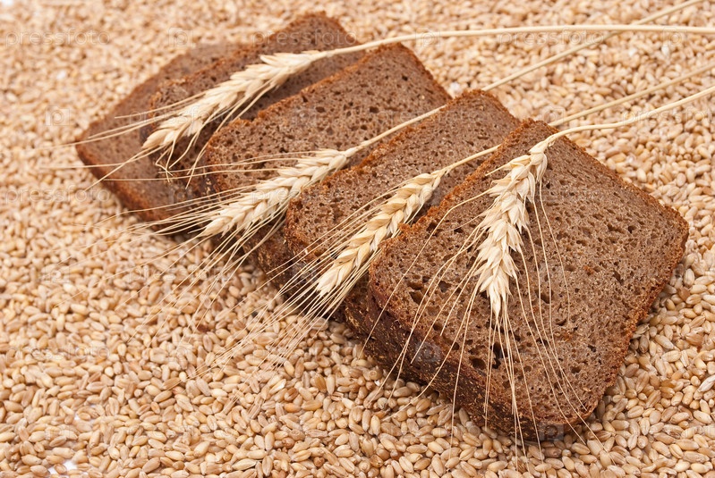 Ломтики хлеба, на которых лежат колосья, на фоне зерен