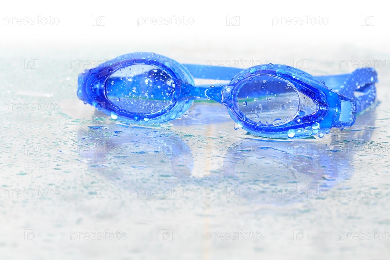 Плавательные мокрые очки на белом фоне