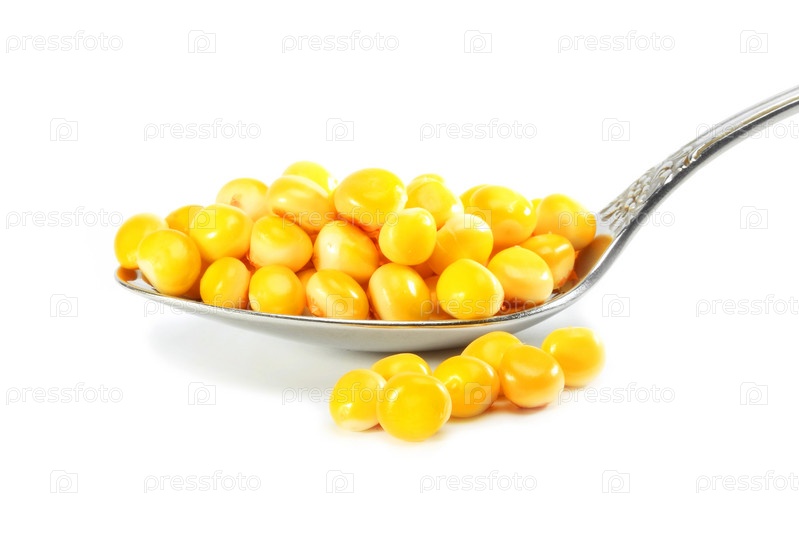 Семена кукурузы в столовой ложке, изолированные на белом фоне
