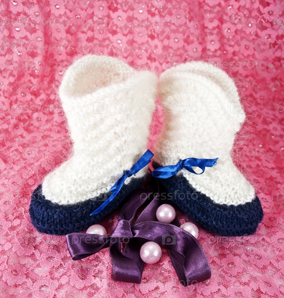 Детские пинетки на розовом фоне с жемчугом