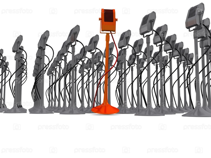 Оранжевый микрофон среди множества серых, 3D