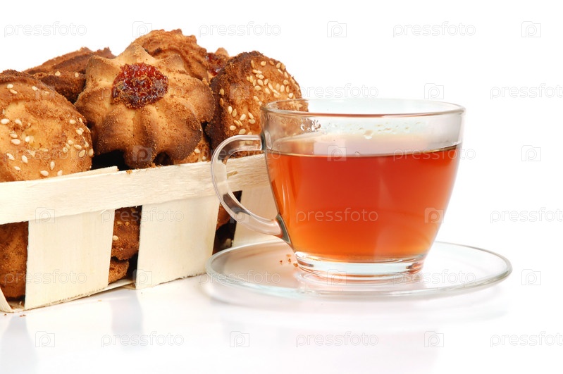Кружка чая и корзинка с печеньем, изолированные на белом фоне