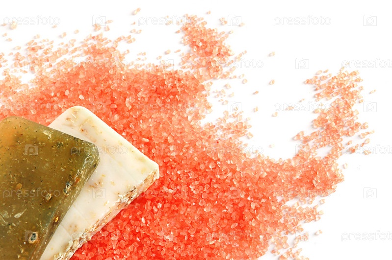 Два куска мыла и рассыпанная розовая соль на белом фоне