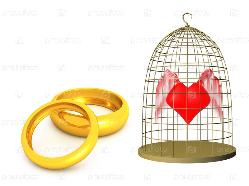 Красное сердце в клетке и обручальные кольца. 3D