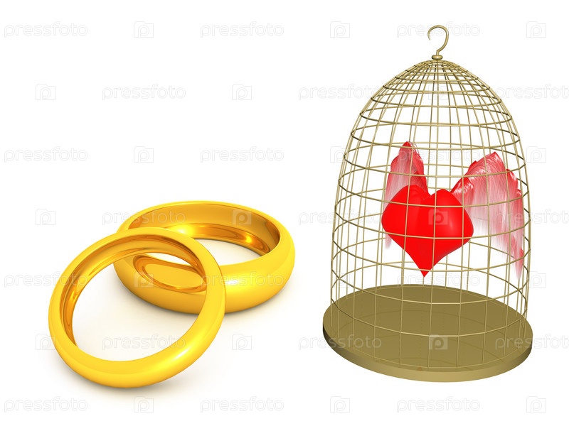 Красное сердце в клетке и обручальные кольца. 3D