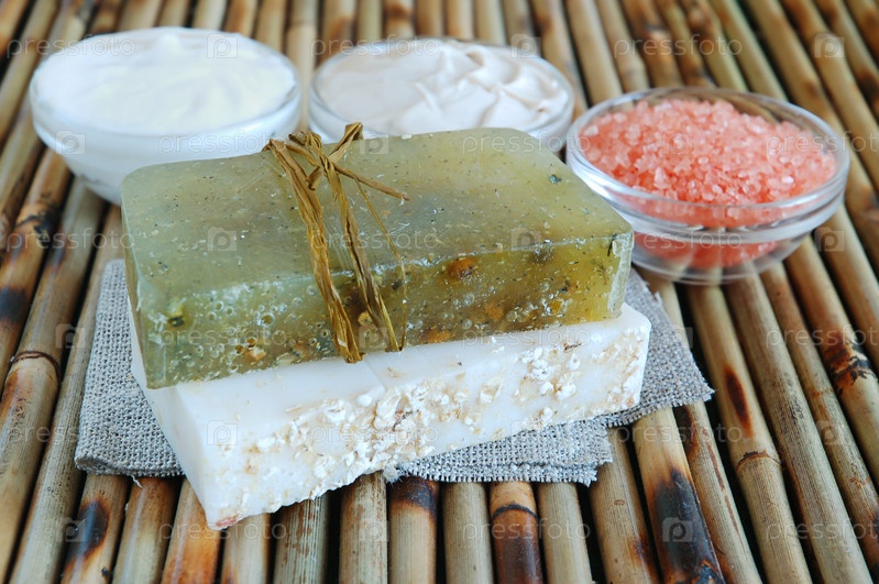 Куски мыла и банки с морской солью и кремами, стоящие на бамбуковой поверхности
