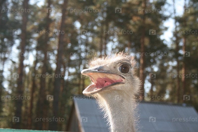 Голова страуса с раскрытым клювом на фоне соснового бора
