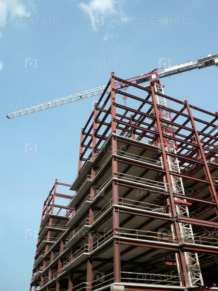 Строительный кран, возводящий каркас здания на фоне голубого неба