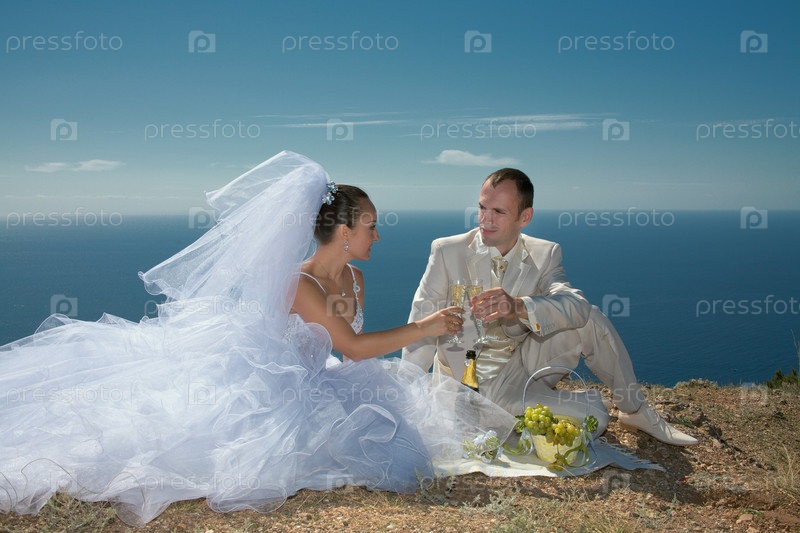 Молодожены пьют шампанское на берегу моря