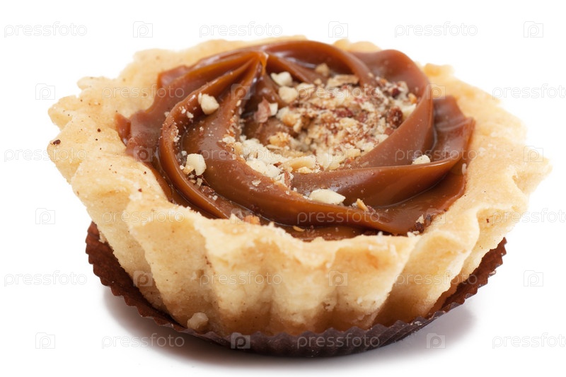 Пирожное в форме корзинки, посыпанное орехами, на белом фоне