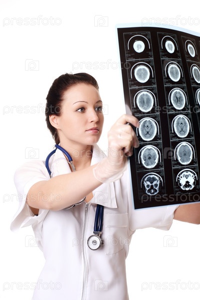 Женщина-врач с рентгеном мозга