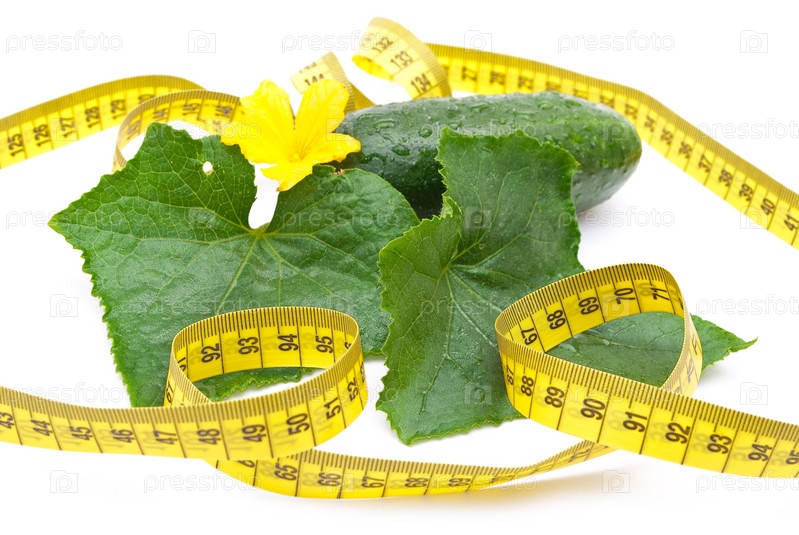Свежий огурец с листьями и сантиметровой лентой на белом фоне