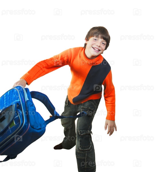 Мальчик в оранжевом свитере с портфелем