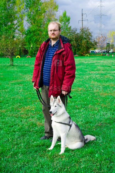 Мужчина с собакой породы сибирский хаски