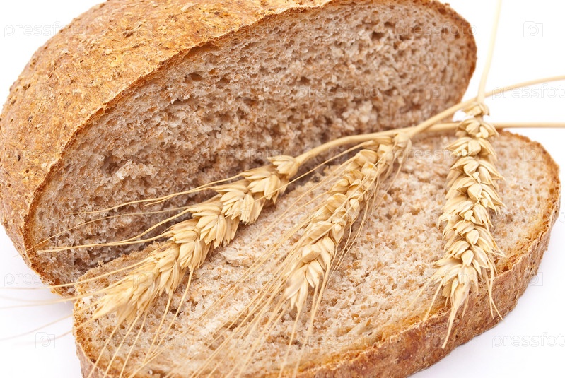 Ломоть ржаного хлеба с колосьями на белом фоне