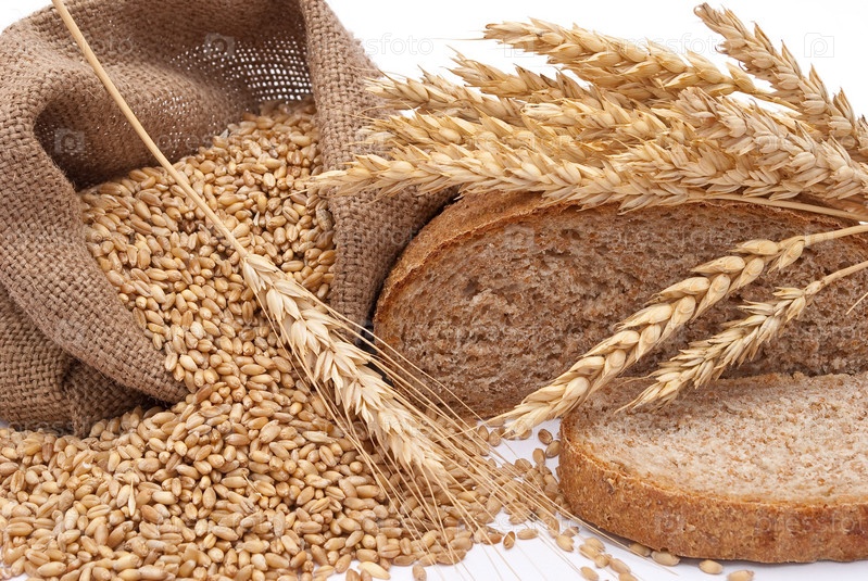 Мешок с зерном, хлеб и колосья пшеницы на белом фоне