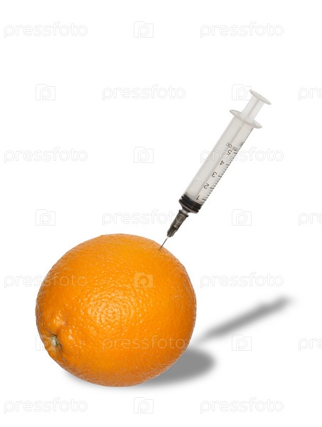 Пластиковый шприц с иглой воткнут в апельсин