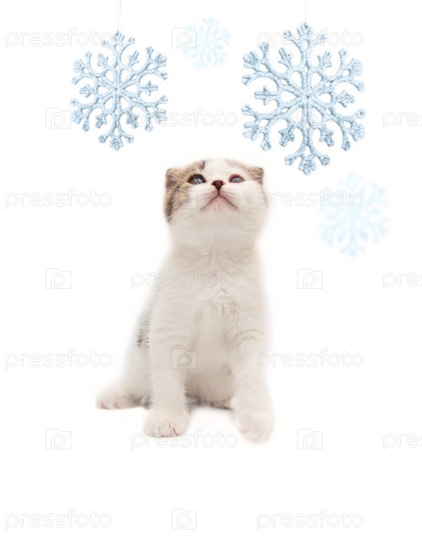 Котенок смотрит на снежинки. Изоляция на белом фоне
