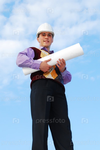 Молодой строитель в каске с чертежами