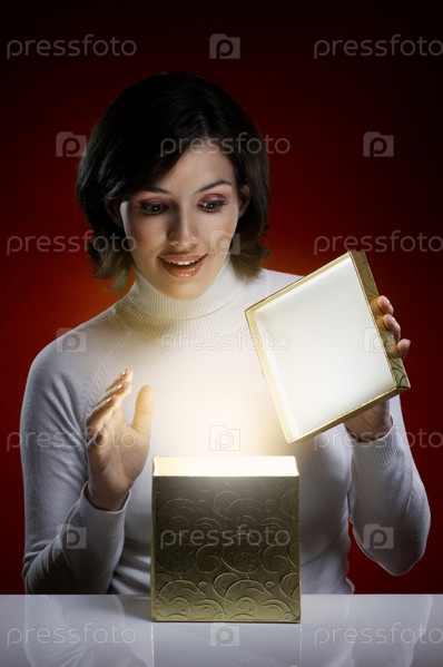 Молодая девушка, открывшая подарок на белом столе