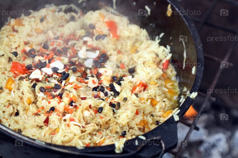 Крупным планом черный казан с пловом