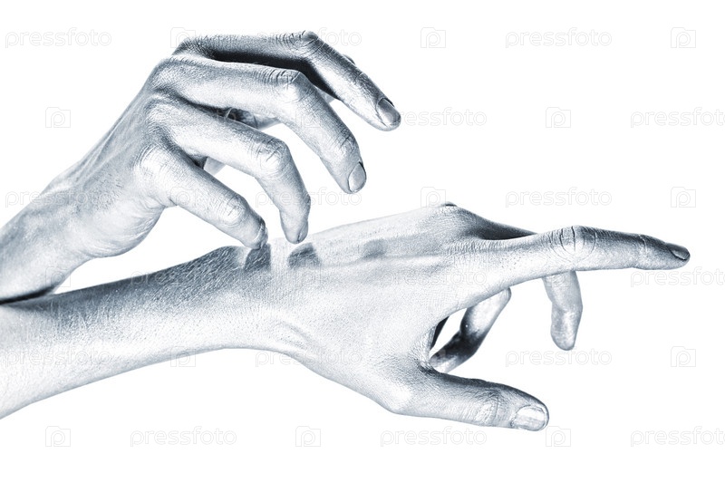 Мужские руки в серебряной краске на белом фоне