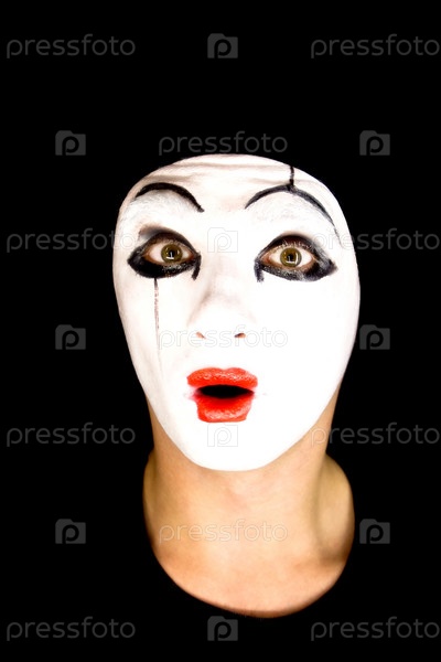 Лицо испуганного мима на черном фоне