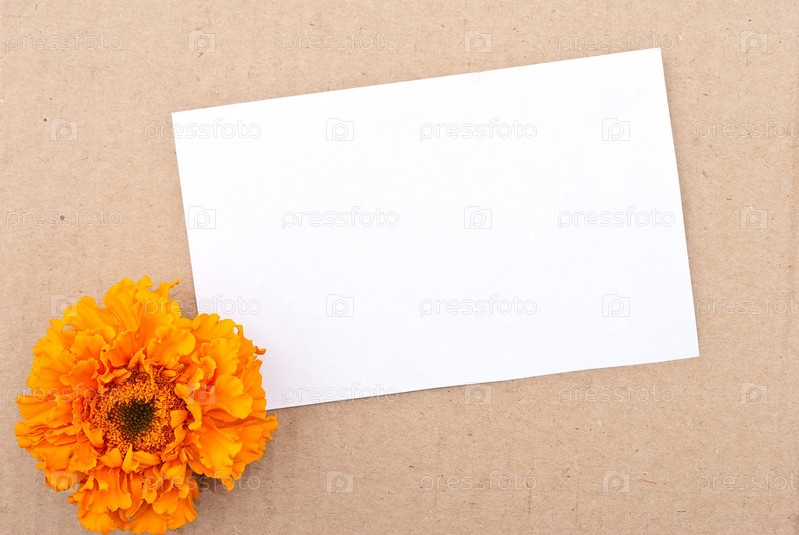 Белый листок бумаги рядом с оранжевым цветком крупным планом